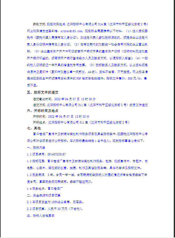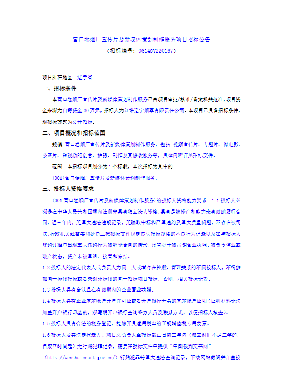 营口卷烟厂宣传片及新媒体策划制作服务项目招标公告