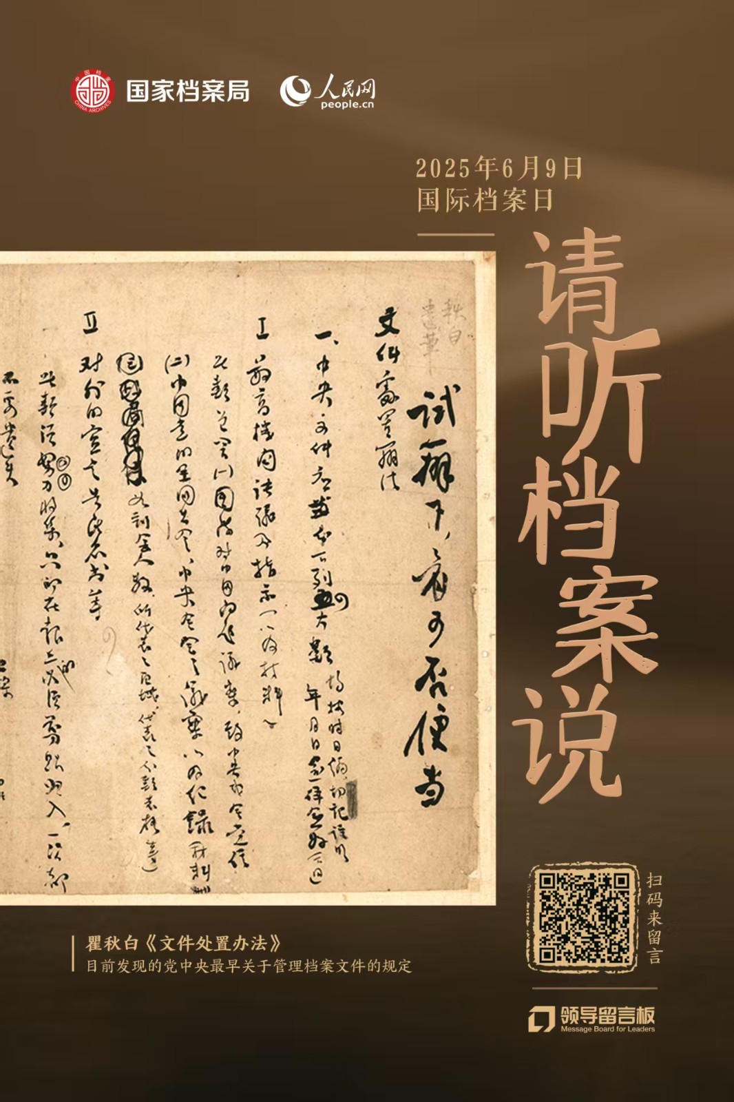 1948年6月9-11日,位于巴黎的联合国教科文组织(UNESCO)召开了一场专家会议,来自世界上许多国家的档案工作者参加了会议交流,经大家讨论决定成立国际档案理事会(ICA)。会上通过了ICA的份章程,章程中指出,世界各国的档案工作者应共同努力“为了全人类”保护好档案,开展鉴定并提供利用;档案和文件作为全世界共享的遗产和全人类一样具有同一性。